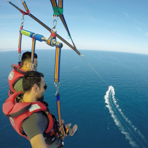 Parasailing involves being lifted into the air by a parachute while pulled by a speedboat. Once airborne, you glide over the sea and enjoy panoramic views of the Barcelona coastline.